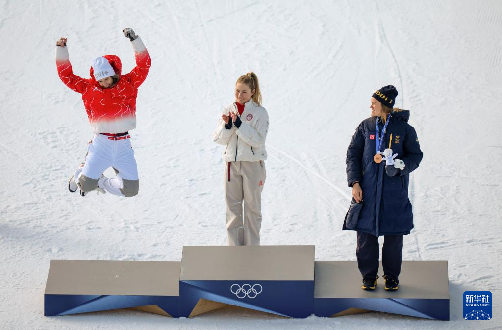 2月18日,冠军美国选手希夫林(中)、亚军瑞士选手拉斯特(左)和季军瑞典选手斯文·拉尔松在颁奖仪式上合影。