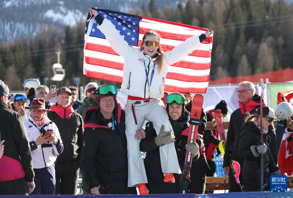 2月18日,冠军美国选手希夫林(上)在颁奖仪式后与队友庆祝。