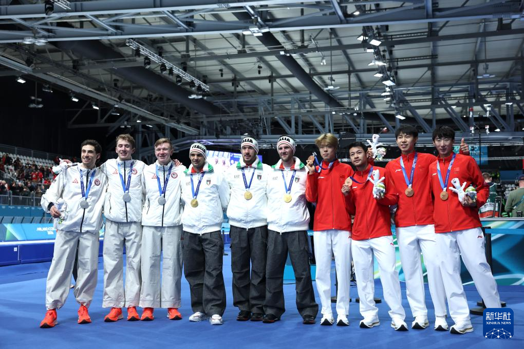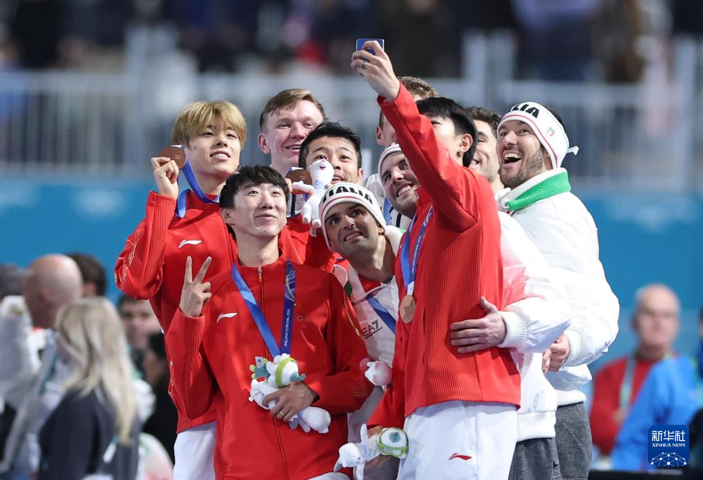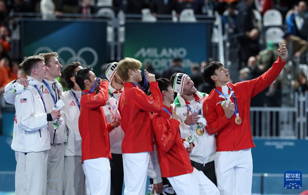 2月17日,冠军意大利队、亚军美国队和季军中国队在颁奖仪式上自拍留影。