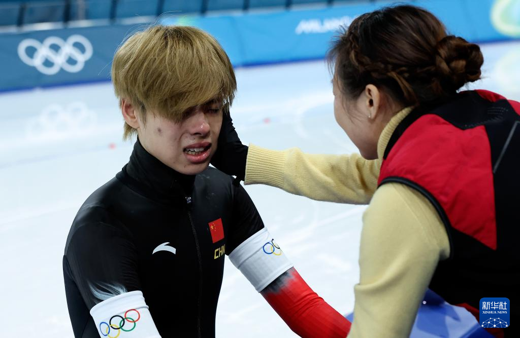 2月17日,中国队选手李文淏(右)和刘瀚彬在赛后拥抱。