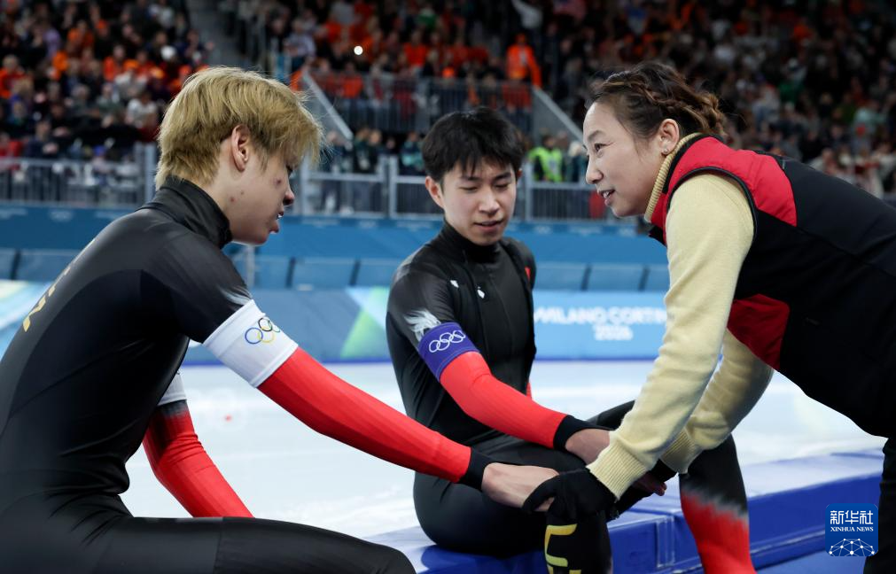 2月17日,中国队选手刘瀚彬(左)、李文淏(中)在赛后与主教练李琰交谈。
