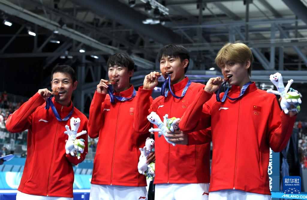 2月17日,季军中国队选手李文淏、刘瀚彬、宁忠岩、吴宇(从左至右)在颁奖仪式上。