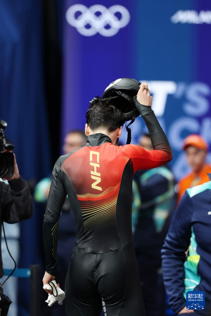 2月18日,中国队选手刘少昂在比赛中冲线后。