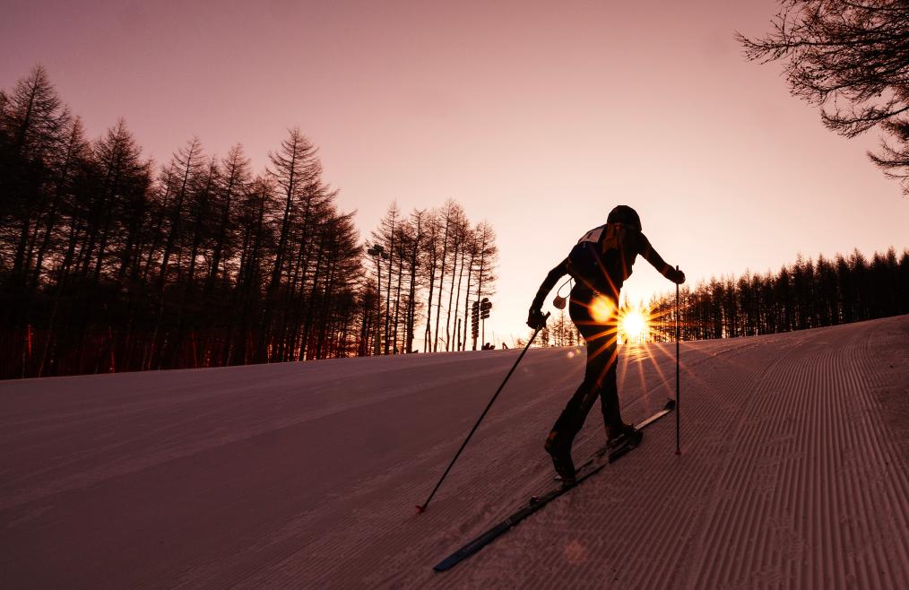“爬”的阶段,专业术语叫作“上升”,选手需在雪板下粘贴止滑带,或者背着雪板在雪坡上爬升,这是模拟山区居民踩着毛皮雪板攀登雪山,以及遇到崎岖山路时背板徒步登山的过程;而“下滑”环节则与高山滑雪有些类似,模拟了人们下山绕障碍物滑行的过程。