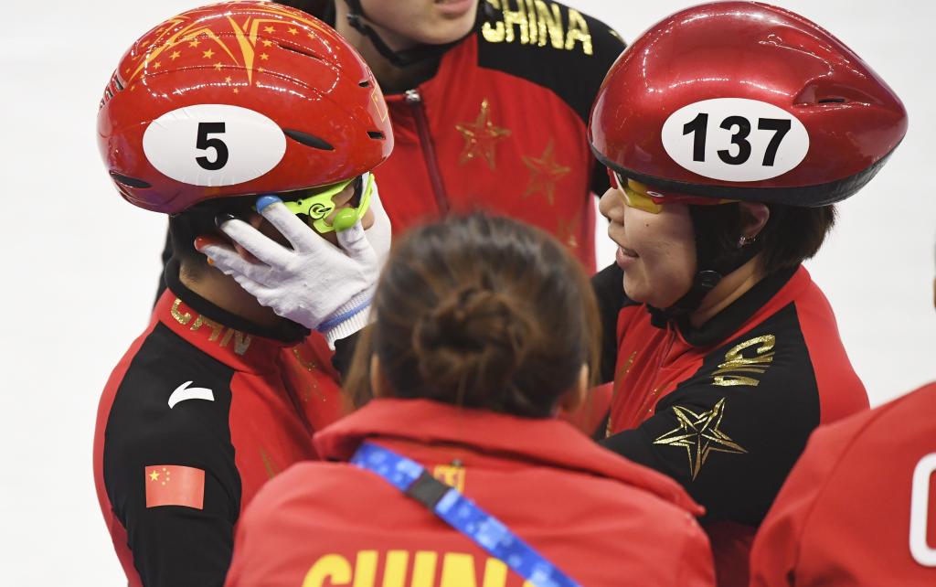 2018年2月20日,在平昌冬奥会短道速滑女子3000米接力A组决赛中被判犯规后,中国队选手周洋(右)安慰队友范可新。 新华社记者 王松 摄