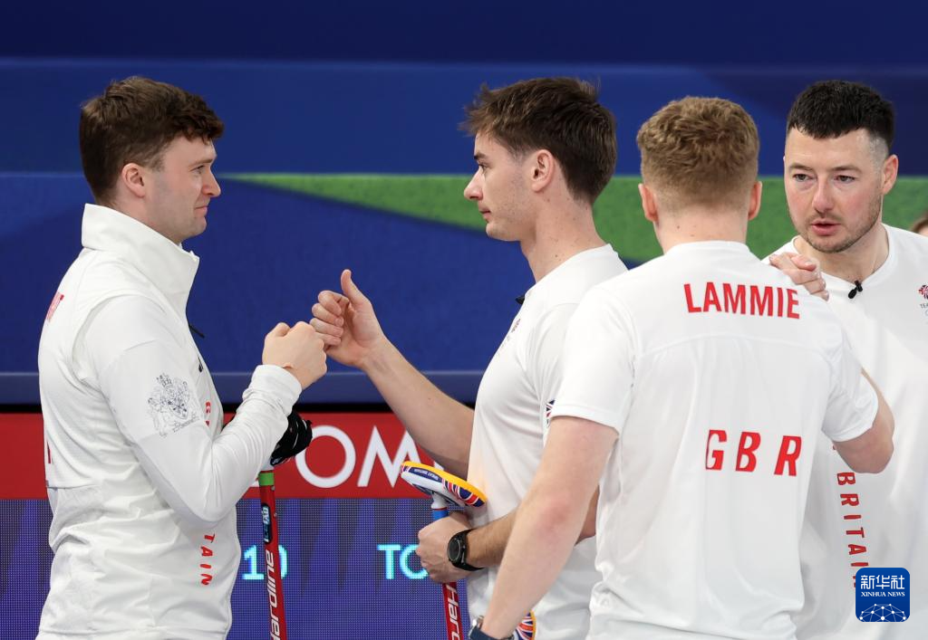 2月18日,英国队选手在比赛后庆祝胜利。英国队9比2战胜美国队。
