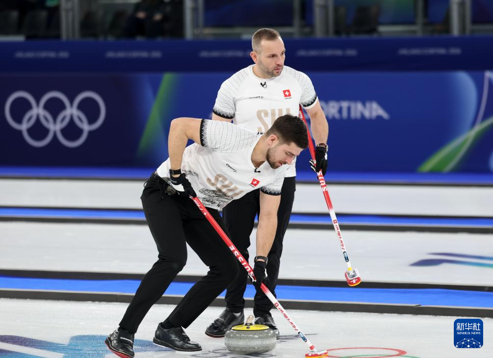 2月18日,瑞士队选手米歇尔(后)和库什潘在对阵挪威队的比赛中。瑞士队10比4战胜挪威队。