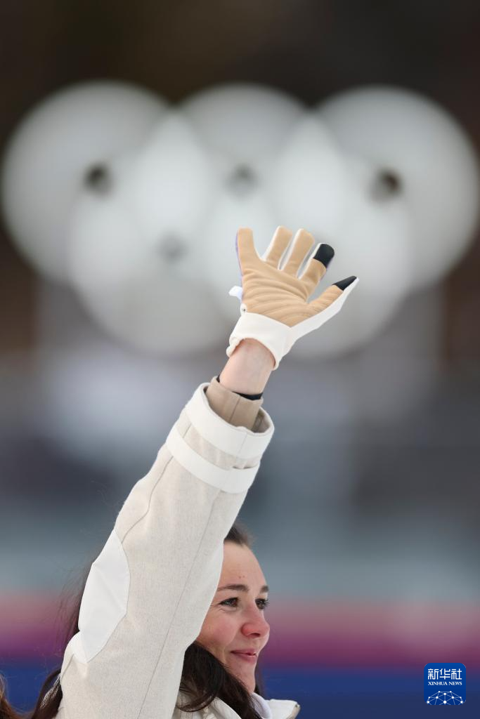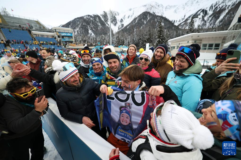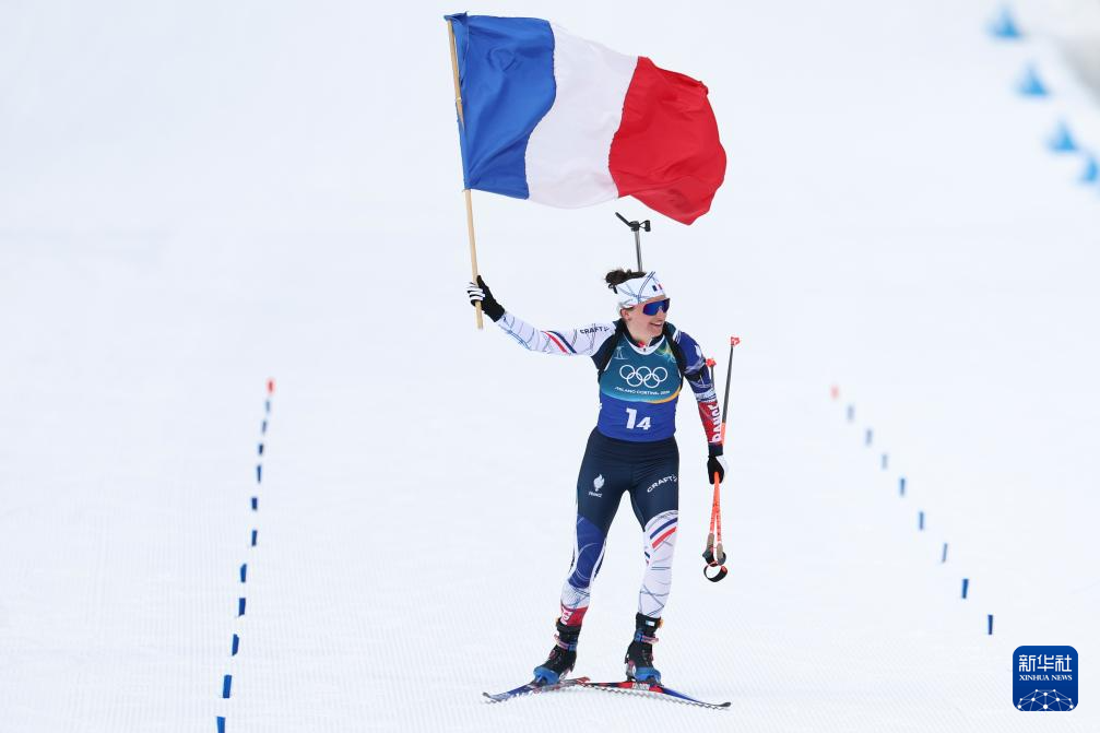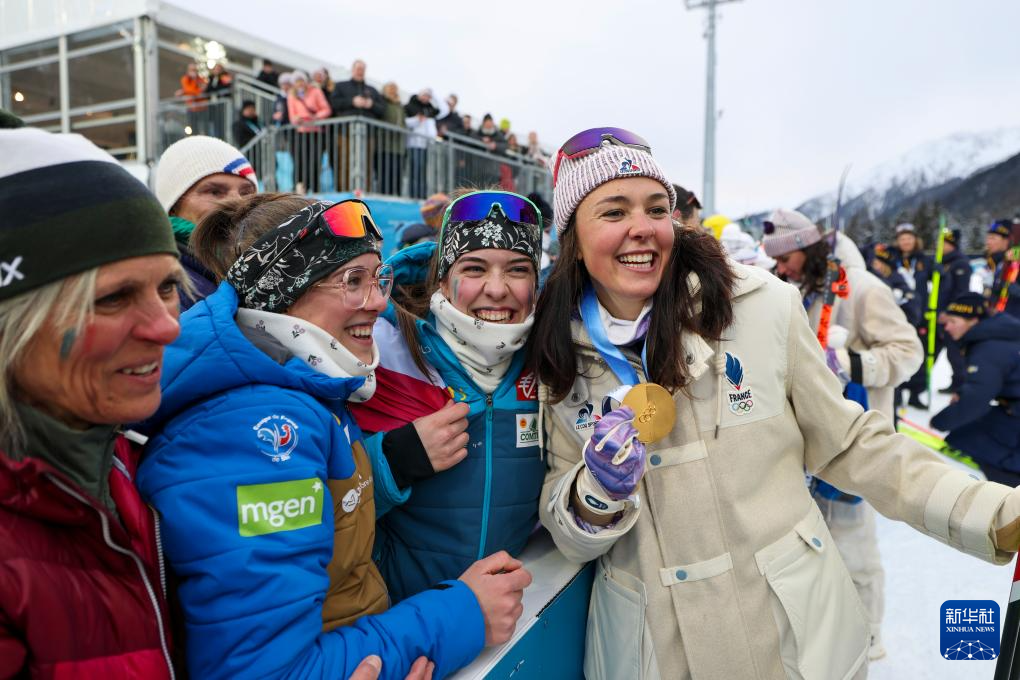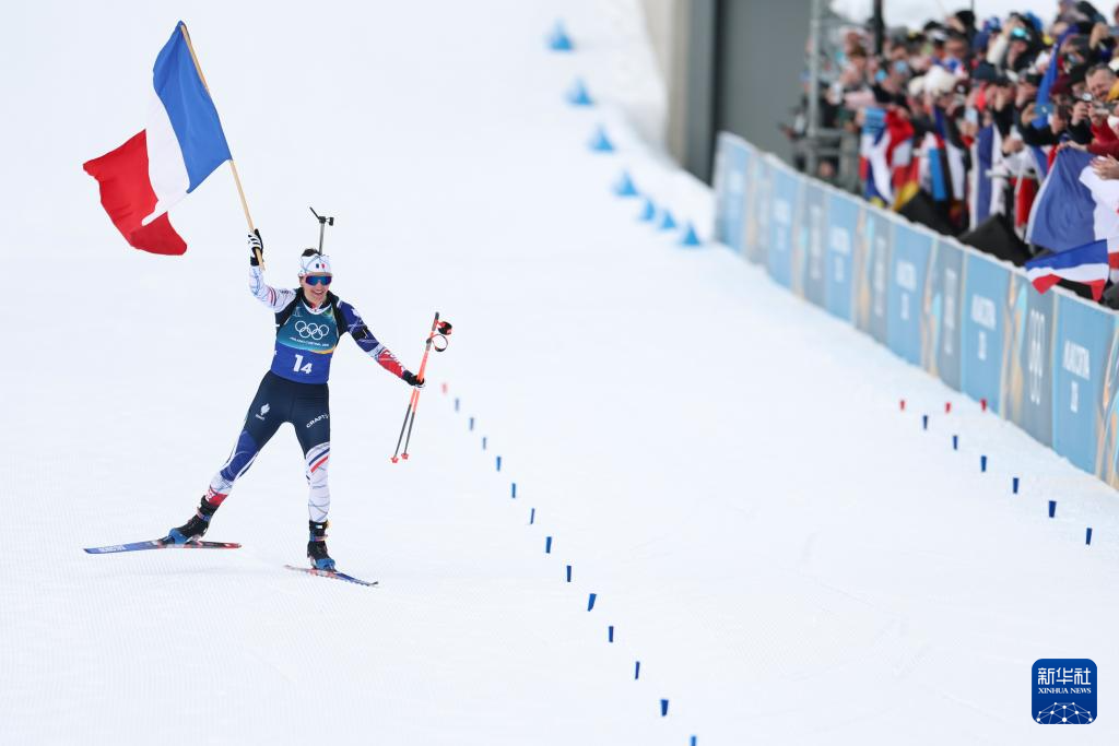 2月18日,法国队选手卡米耶·贝内在颁奖仪式上庆祝。
