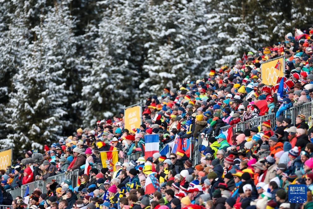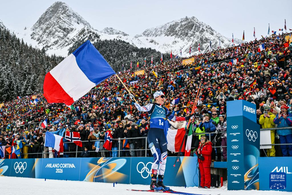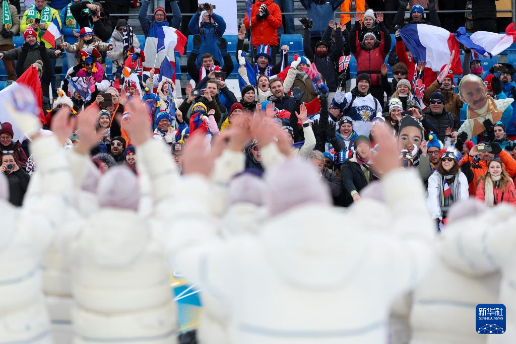 2月18日,法国队选手和看台上的法国观众庆祝。