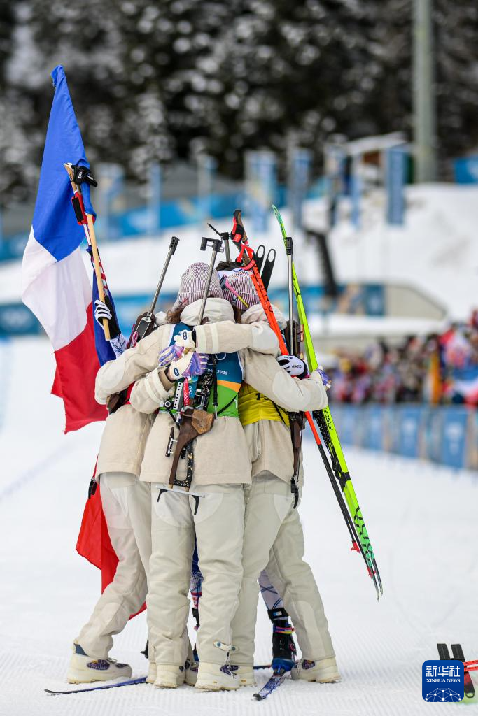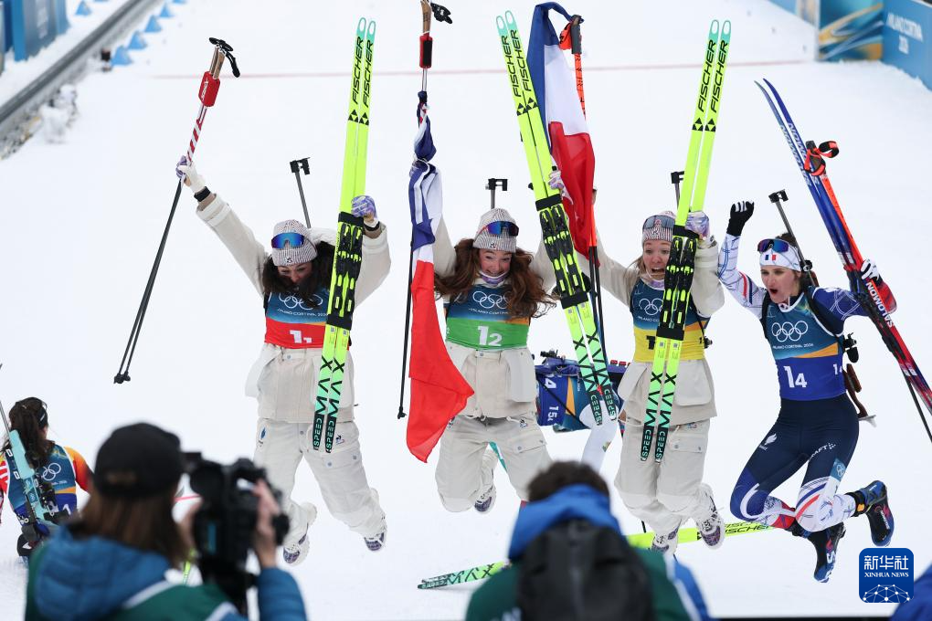 2月18日,法国队选手西蒙(左三)在终点线庆祝。