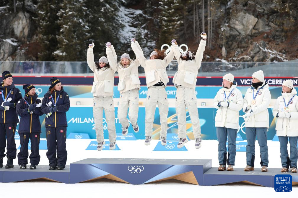 2月18日,季军挪威队在颁奖仪式后庆祝。