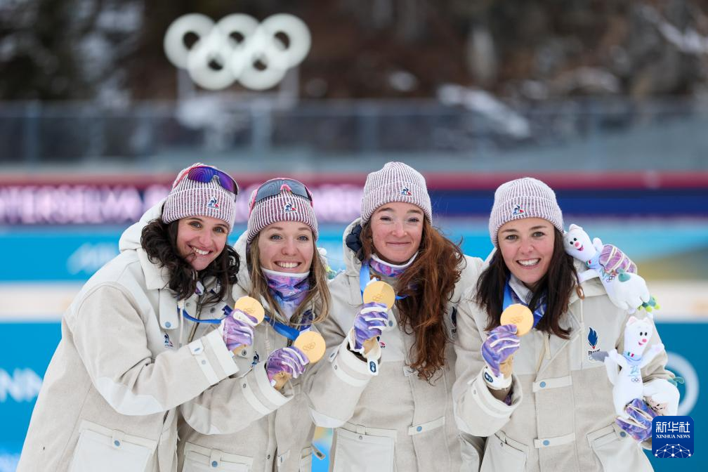2月18日,冠军法国队、亚军瑞典队、季军挪威队在颁奖仪式上合影。