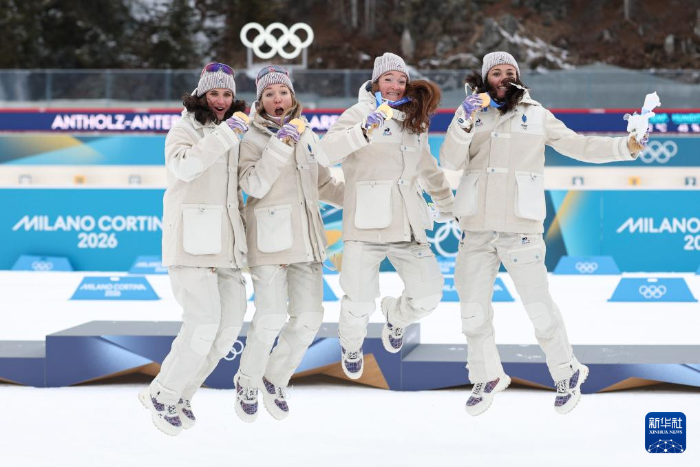 2月18日,法国队运动员和教练员在颁奖仪式后庆祝。