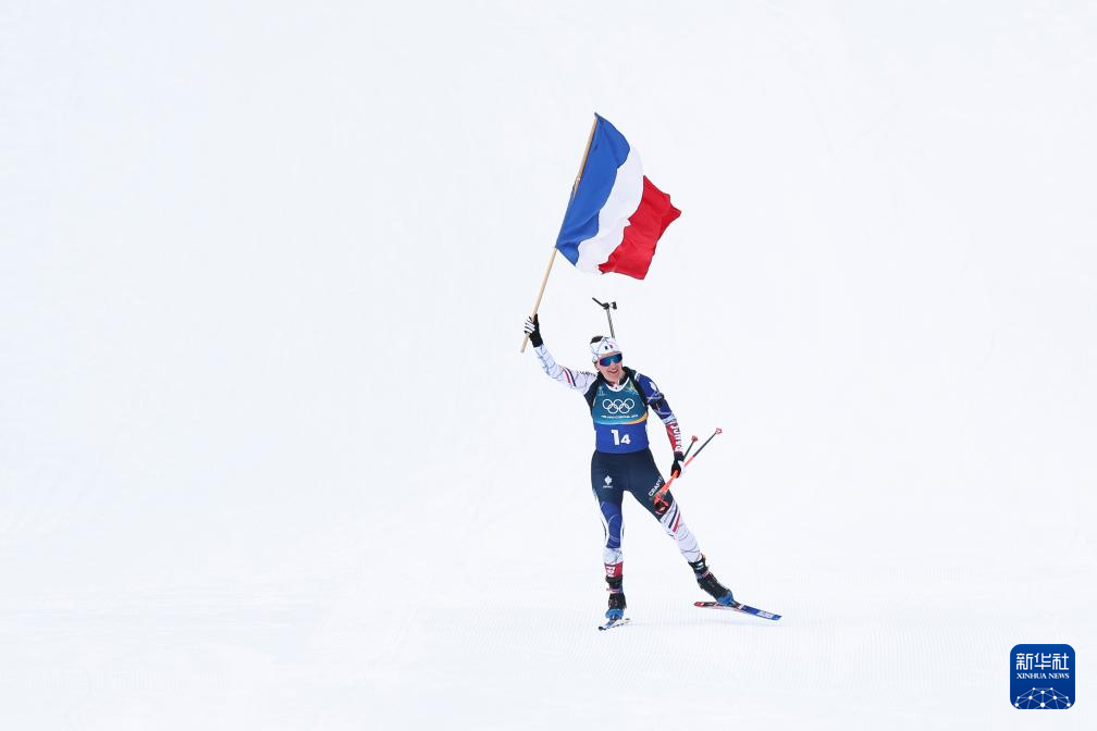 2月18日,法国队选手西蒙在比赛中庆祝。
