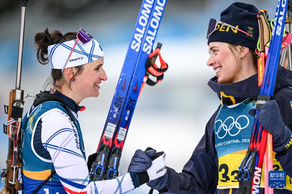 2月18日,法国队选手西蒙(左)与瑞典选手厄贝里在赛后相互致意。