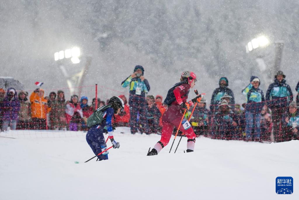 2月19日,法国选手哈罗普(右一)在比赛中。她获得亚军。