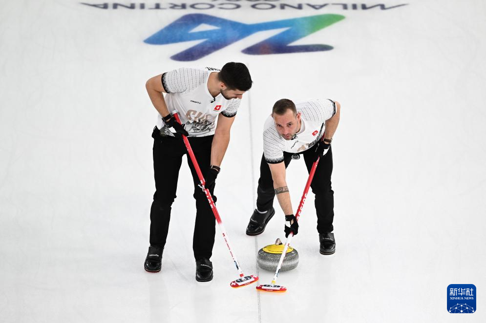 2月19日,瑞士队选手米歇尔(右)在比赛中擦冰。