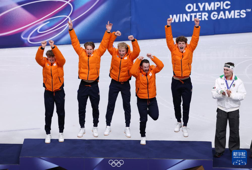 2月20日,冠军荷兰队(后右)、亚军韩国队(后左)和季军意大利队在颁奖仪式上自拍。