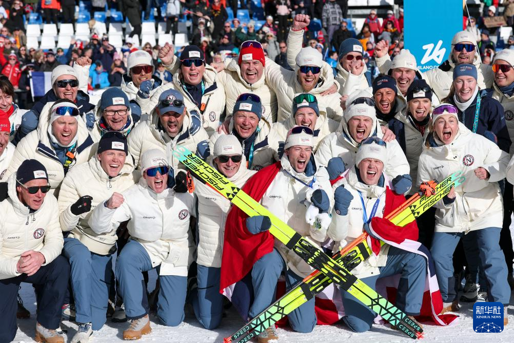 2月20日,亚军挪威选手斯图拉·霍尔姆·莱格雷德和冠军挪威选手约翰内斯·戴尔(左)在终点线庆祝。