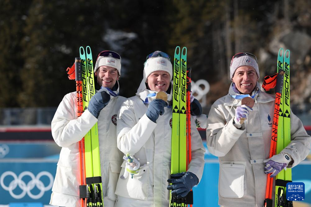 2月20日,亚军挪威选手斯图拉·霍尔姆·莱格雷德、冠军挪威选手约翰内斯·戴尔、季军法国选手康坦·菲永·马耶(从左至右)在终点庆祝。