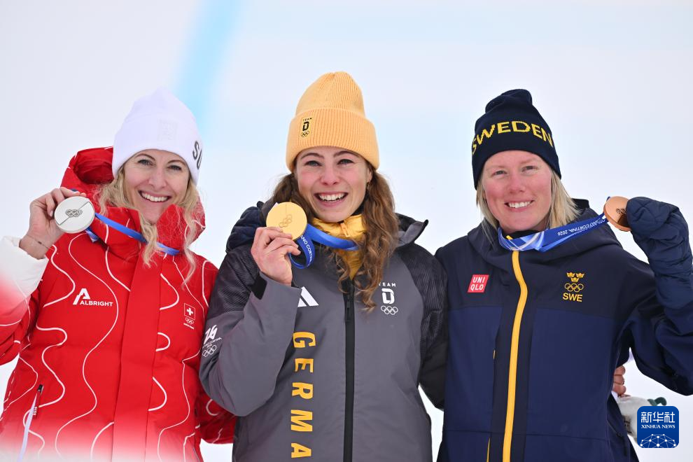 2月20日,冠军德国选手达妮埃拉·迈尔(中)、亚军瑞士选手范妮·史密斯(左)、季军瑞典选手桑德拉·内斯隆德在颁奖仪式上合影。
