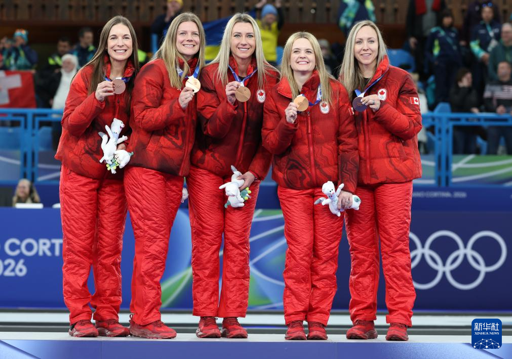 2月22日,季军加拿大队选手蕾切尔·布朗、萨拉·威尔克斯、埃玛·米斯库、特蕾西·弗勒里、蕾切尔·霍曼(从左至右)在颁奖仪式上合影。