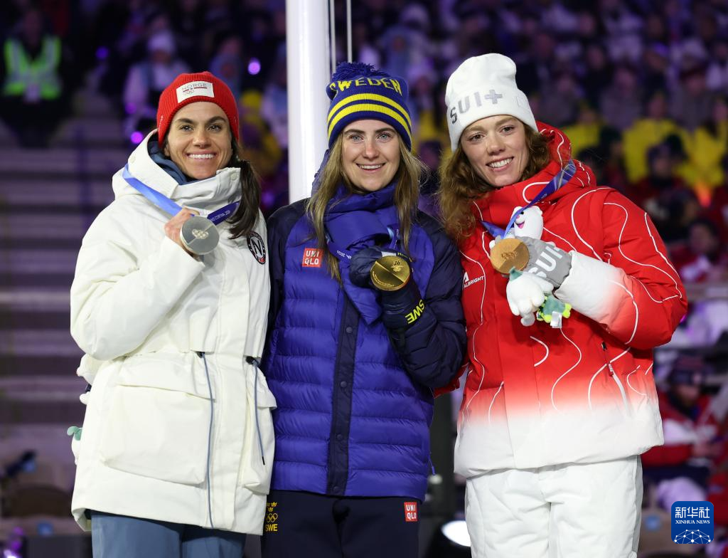 2月22日,越野滑雪女子50公里集体出发(传统技术)冠军瑞典选手安德松(中)、亚军挪威选手文格(左)和季军瑞士选手凯林在闭幕式现场举行的颁奖仪式上。