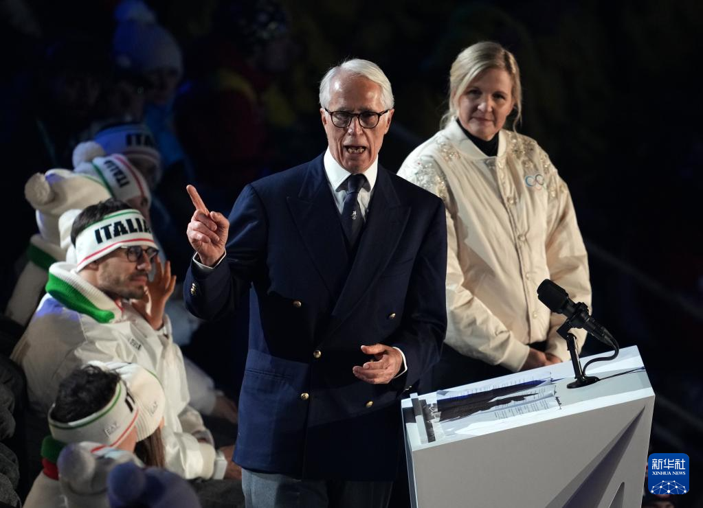 2月22日,米兰-科尔蒂纳冬奥会组委会主席乔瓦尼·马拉戈(右二)在闭幕式上发言。