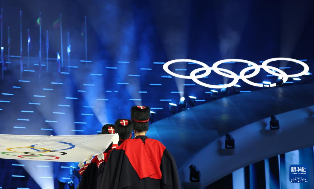 这是2月22日在闭幕式上拍摄的奥林匹克会旗交接仪式。