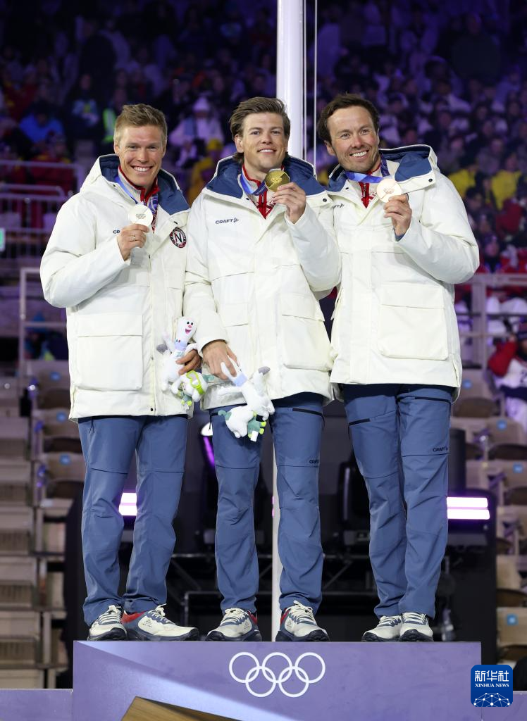 2月22日,越野滑雪男子50公里集体出发(传统技术)冠军挪威选手克莱博(中)、亚军挪威选手尼格特(左)和季军挪威选手伊韦尔森在闭幕式现场举行的颁奖仪式上。