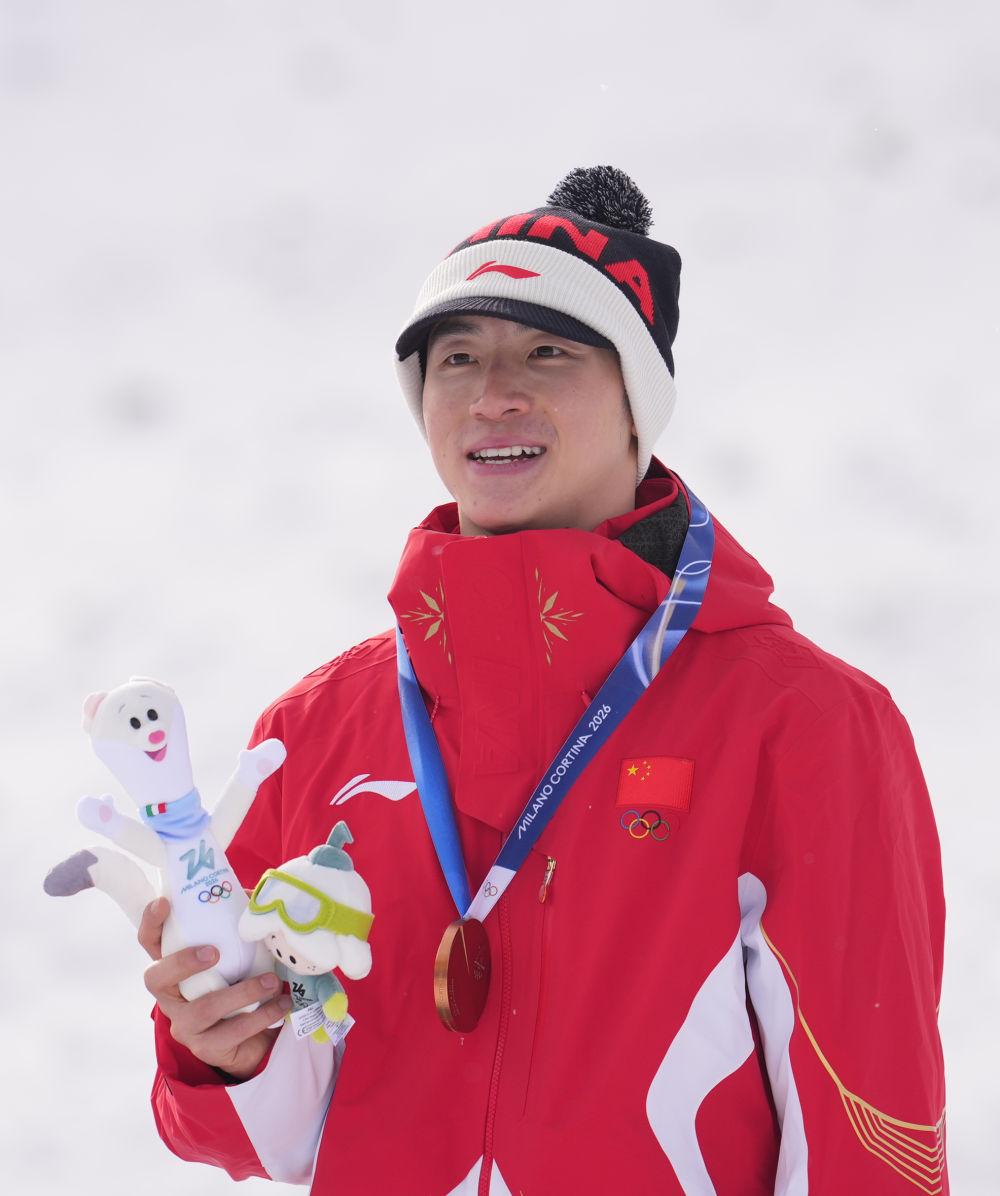 2月20日,李天马在颁奖仪式上。当地时间2月20日,在意大利利维尼奥举行的米兰-科尔蒂纳冬奥会自由式滑雪男子空中技巧决赛中,中国选手李天马获得铜牌。新华社记者 胡超 摄