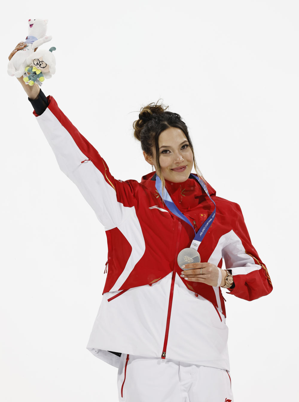 2月16日,谷爱凌在颁奖仪式上。当地时间2月16日,在意大利利维尼奥举行的米兰-科尔蒂纳冬奥会自由式滑雪女子大跳台决赛中,中国选手谷爱凌获得亚军。新华社记者 王鹏 摄