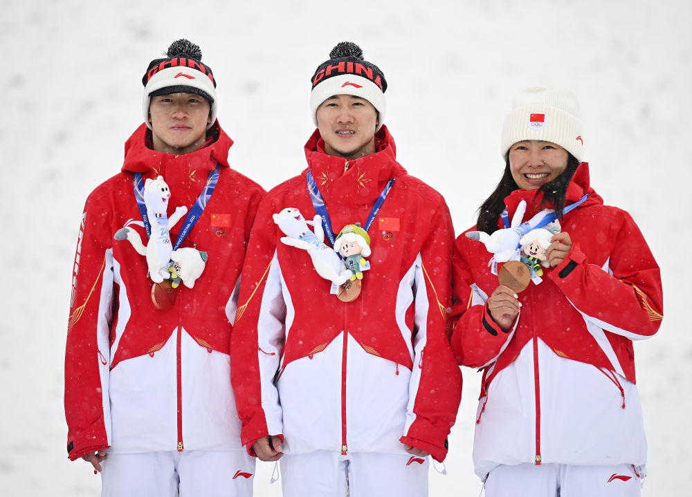 2月21日,徐梦桃、王心迪、李天马(从右至左)在颁奖仪式上。当地时间2月21日,米兰-科尔蒂纳冬奥会自由式滑雪空中技巧混合团体决赛在意大利利维尼奥举行,中国队获得铜牌。新华社记者 张宏祥 摄