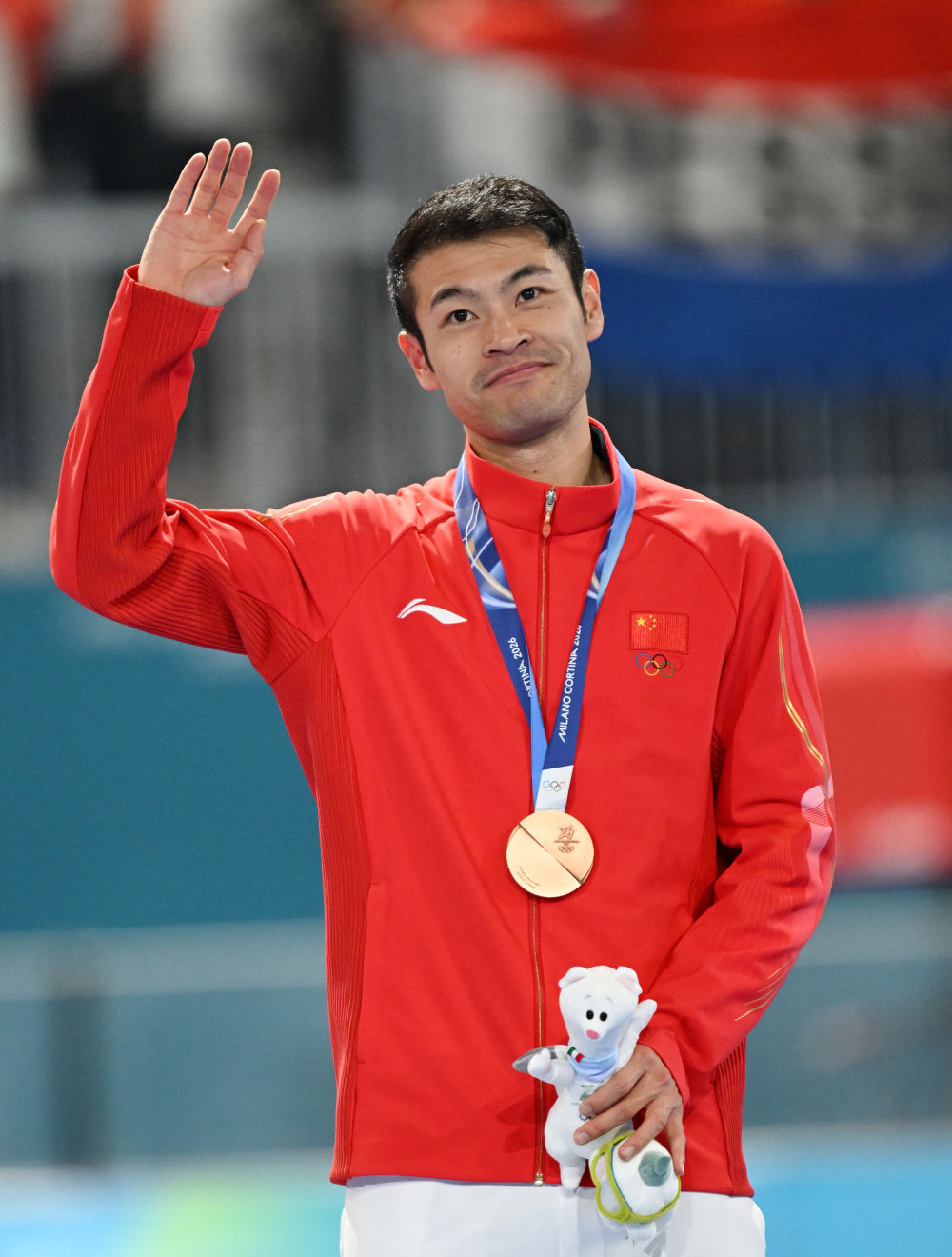 2月11日,宁忠岩在颁奖仪式上。当地时间2月11日,米兰-科尔蒂纳冬奥会速度滑冰男子1000米决赛在意大利米兰举行,中国选手宁忠岩获得铜牌。新华社记者 武巍 摄