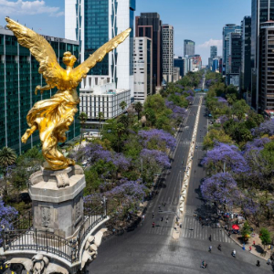 这是2025年3月23日在墨西哥首都墨西哥城拍摄的盛开的蓝花楹和独立天使纪念碑(无人机照片)。新华社记者 李木子 摄