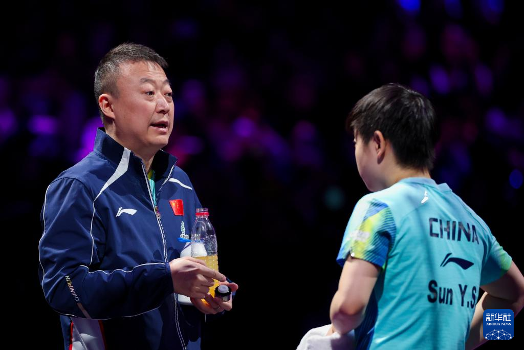 3月12日,教练马琳(左)在比赛间隙指导孙颖莎。