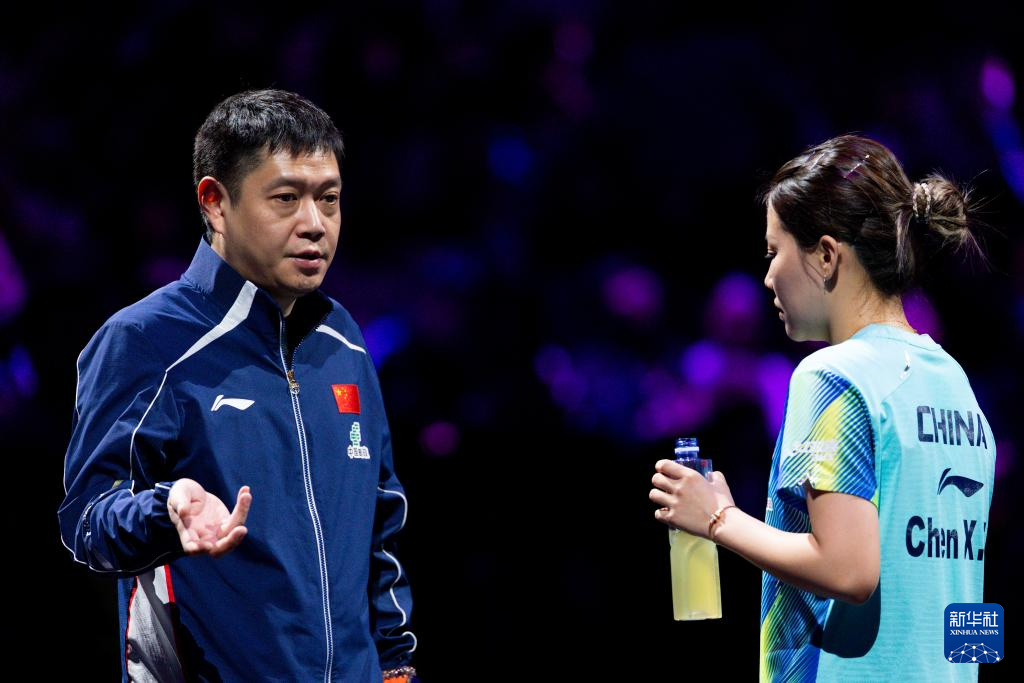 3月12日,教练邱贻可(左)在比赛间隙指导陈幸同。