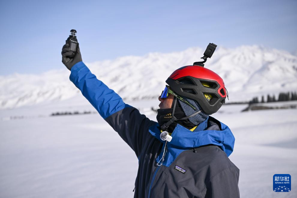 在新疆伊犁河谷东部山区,程鹏抵达准备进行风筝滑雪的场地后测量现场风力(3月15日摄)。
