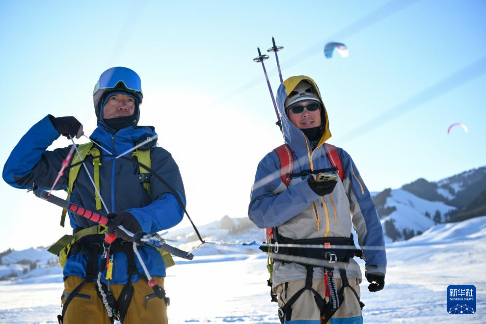 在新疆伊犁河谷东部山区,程鹏(左)和同伴进行风筝滑雪(3月14日摄)。