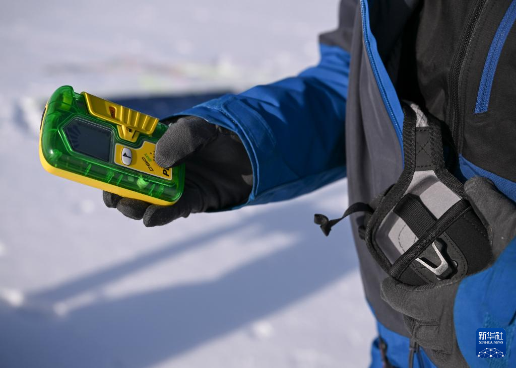 滑行前,程鹏将雪崩信标装进贴身口袋,便于遇险时第一时间施救(3月15日摄)。