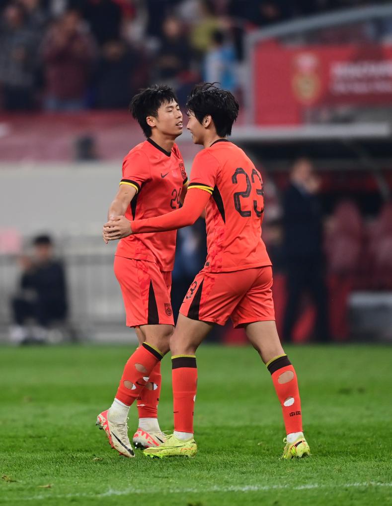 3月25日,中国队球员李新翔(右)在进球后与队友汪士钦庆祝。新华社记者 邹竞一 摄
