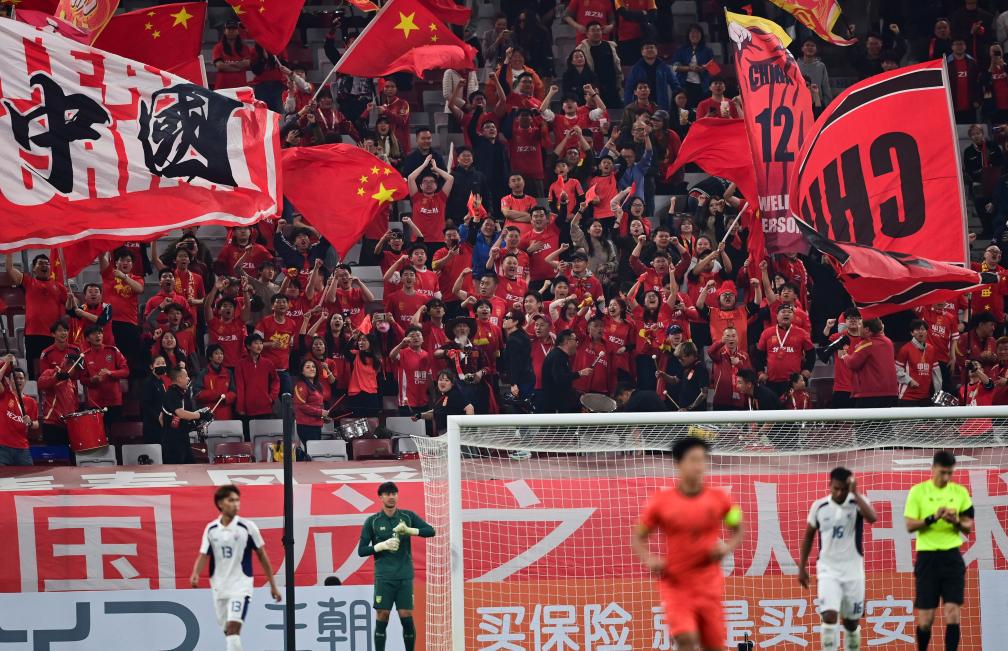 3月25日,球迷在中国队进球后庆祝。新华社记者 邹竞一 摄