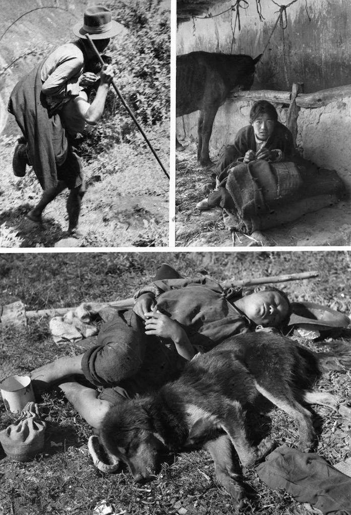 上图左:西藏农奴制度下的“人背人”(即农奴像牲畜一样背驮着农奴主)差役。上图右:和牲口同住的农奴。下图:农奴益西钦沛服劳役后与犬同眠。新华社发(1992年9月19日发)