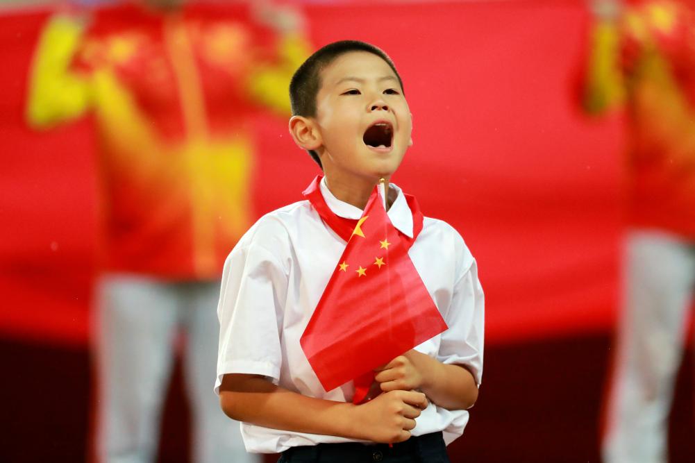 2025年9月27日,小朋友在“苏超”淮安队对阵徐州队的比赛前演唱《歌唱祖国》。新华社发(徐昌政 摄)