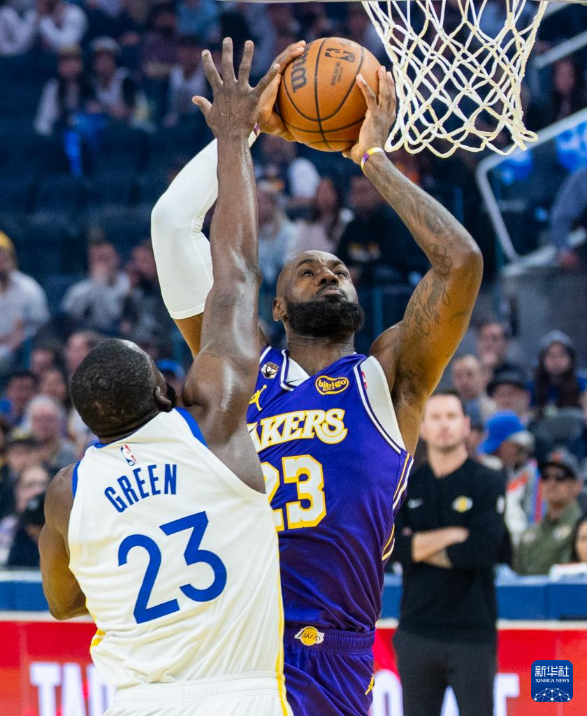 4月9日,勇士队球员格林(左)在湖人队球员勒布朗·詹姆斯的防守下传球。