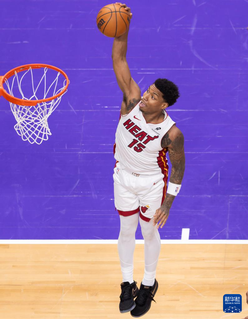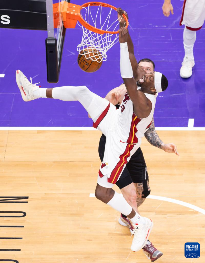 4月9日,热火队球员阿德巴约(前)在比赛中扣篮。
