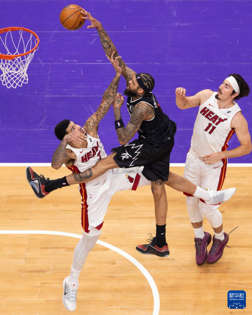 4月9日,热火队球员拉尔森(左)与猛龙队球员英格拉姆(右)在比赛中争抢篮板球。