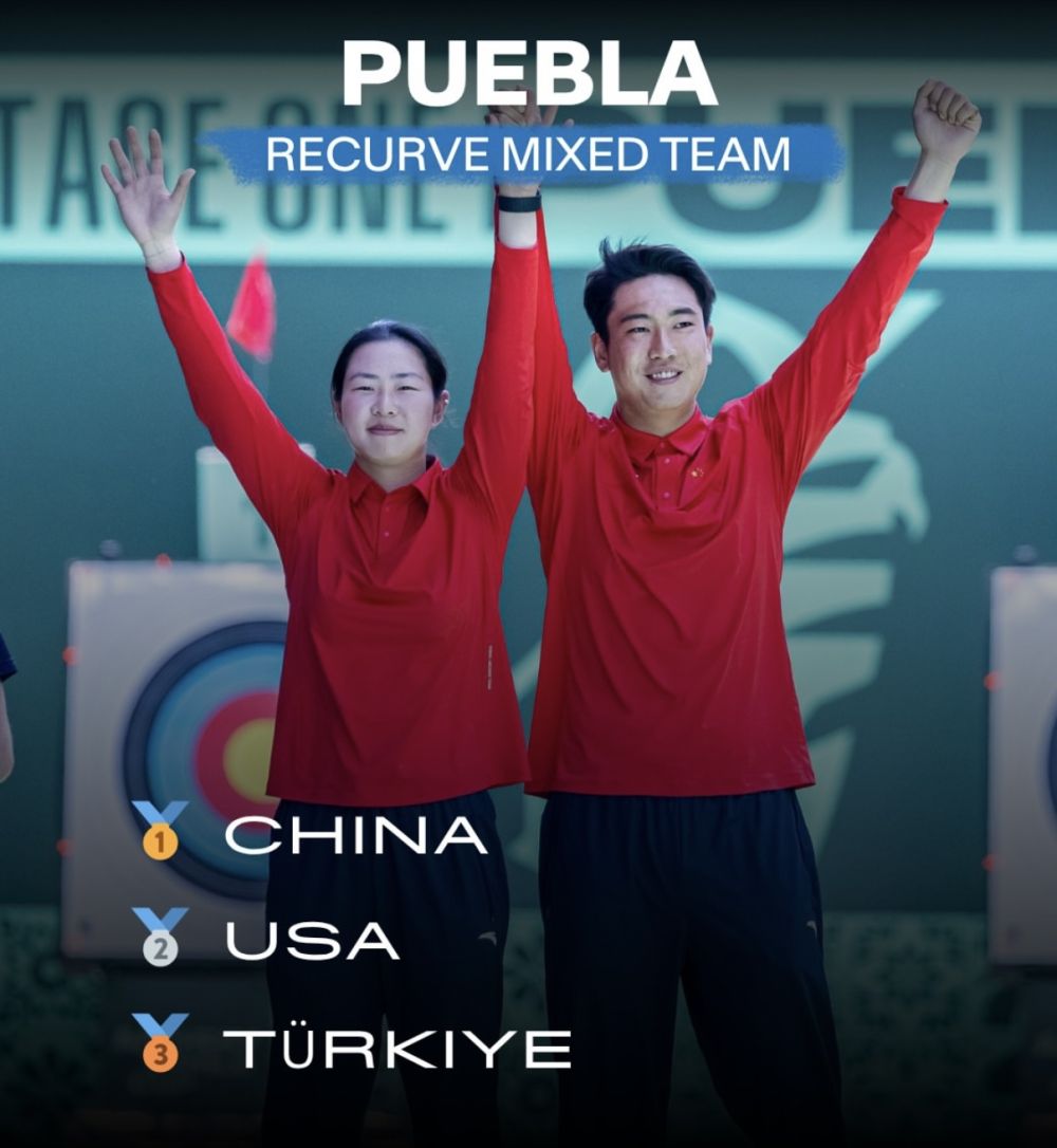 朱静怡(左)、孙景宣组成的中国队获得2026射箭世界杯墨西哥普埃布拉站反曲弓混合团体金牌。图片来自国际射箭联合会官方社交媒体账号