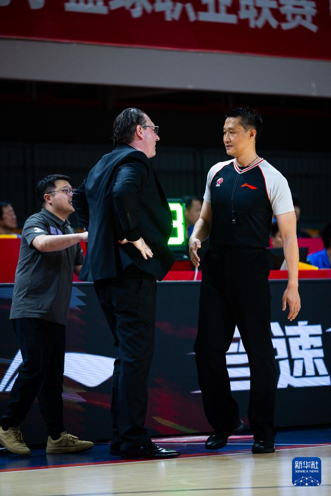 4月20日,福建晋江文旅队主教练凯撒(左)与裁判发生争执。