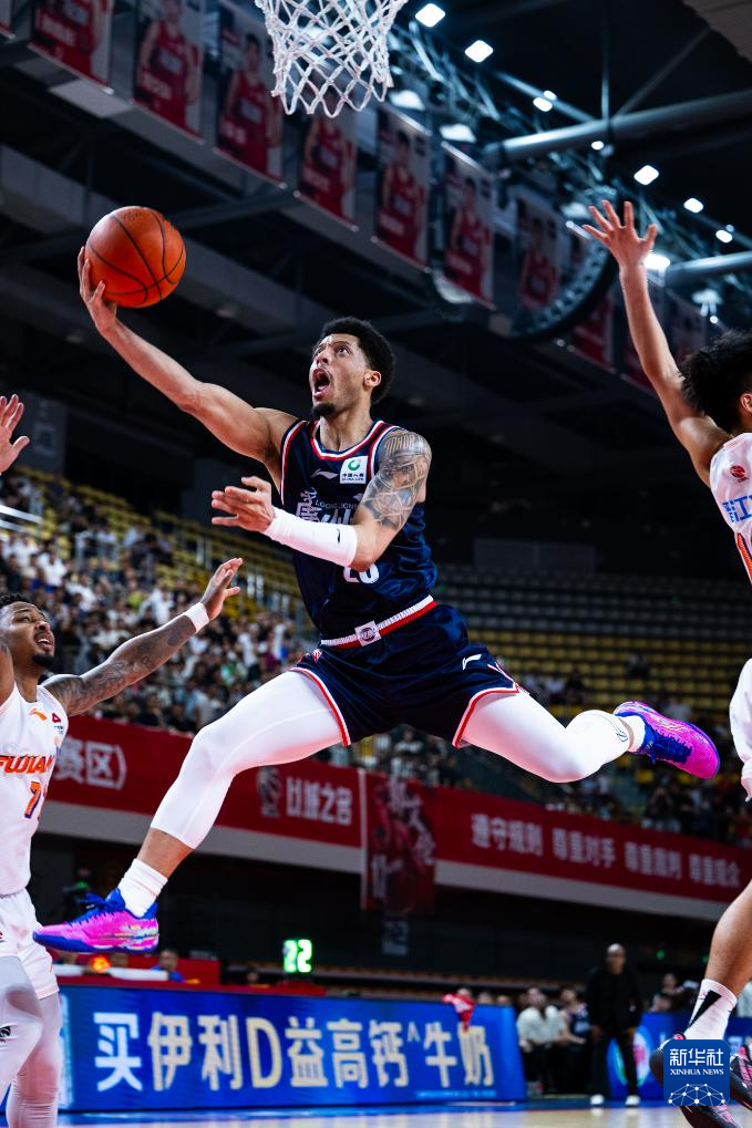 4月20日,福建晋江文旅队球员布罗兹安斯基(上左)在比赛中扣篮。